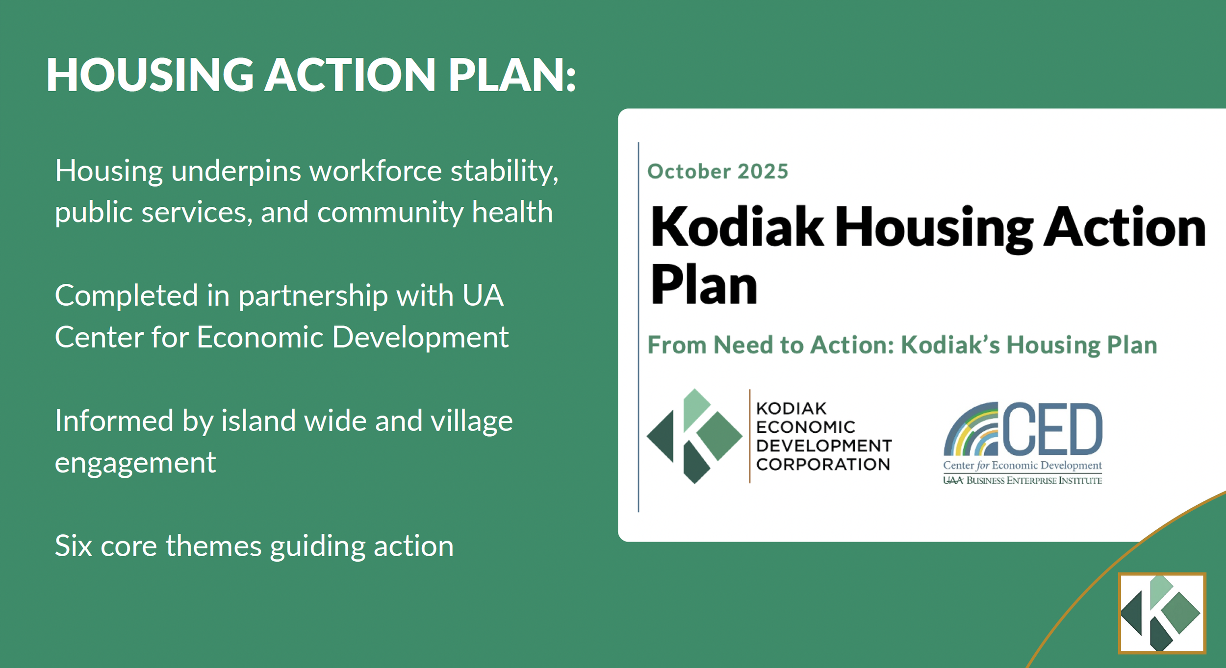 In 2025, KEDC continued its partnership with the to facilitate the Housing Steering Committee and support the development of implementation-focused recommendations grounded in the Kodiak Housing Action Plan. CED’s role includes helping structure work sessions, analyze policy options, and translate plan strategies into clear, actionable pathways that local decision makers can consider.
